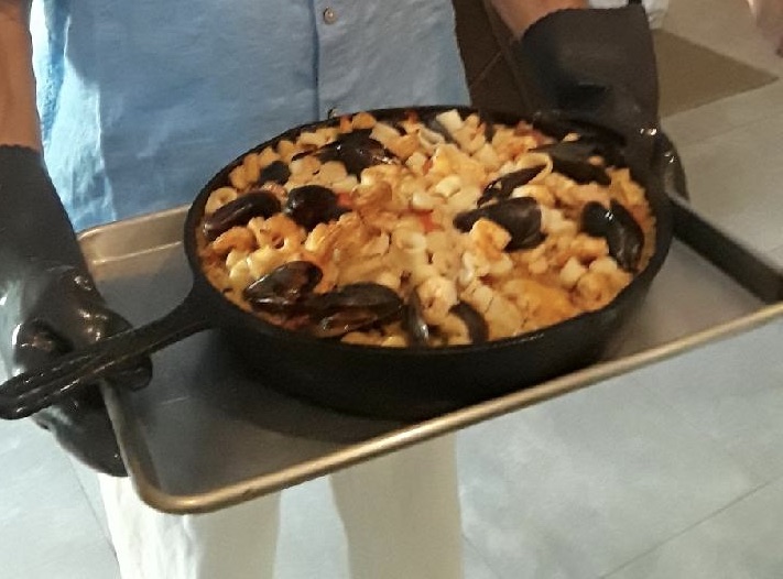 In a large cast iron pan or paella pan, add the rice and top with the peppers, then the frozen sea food. Mix the chicken stock with the lemon and pour over the rice. Do not stir.